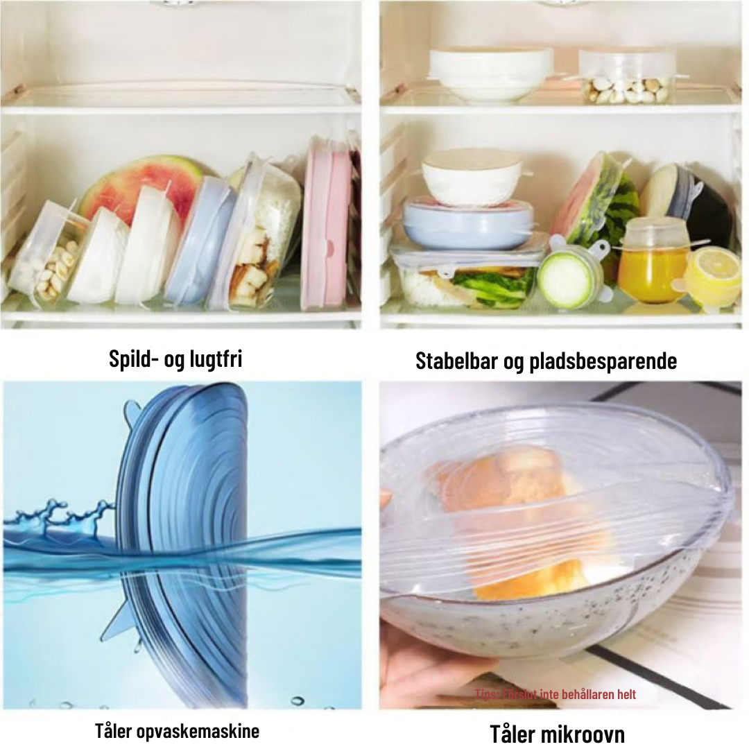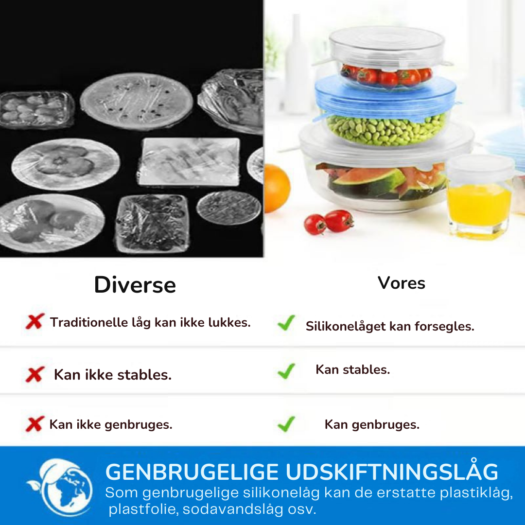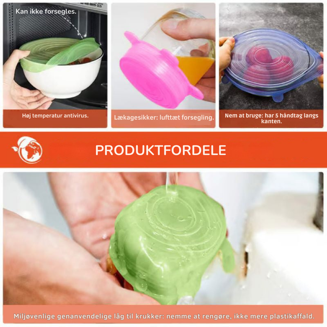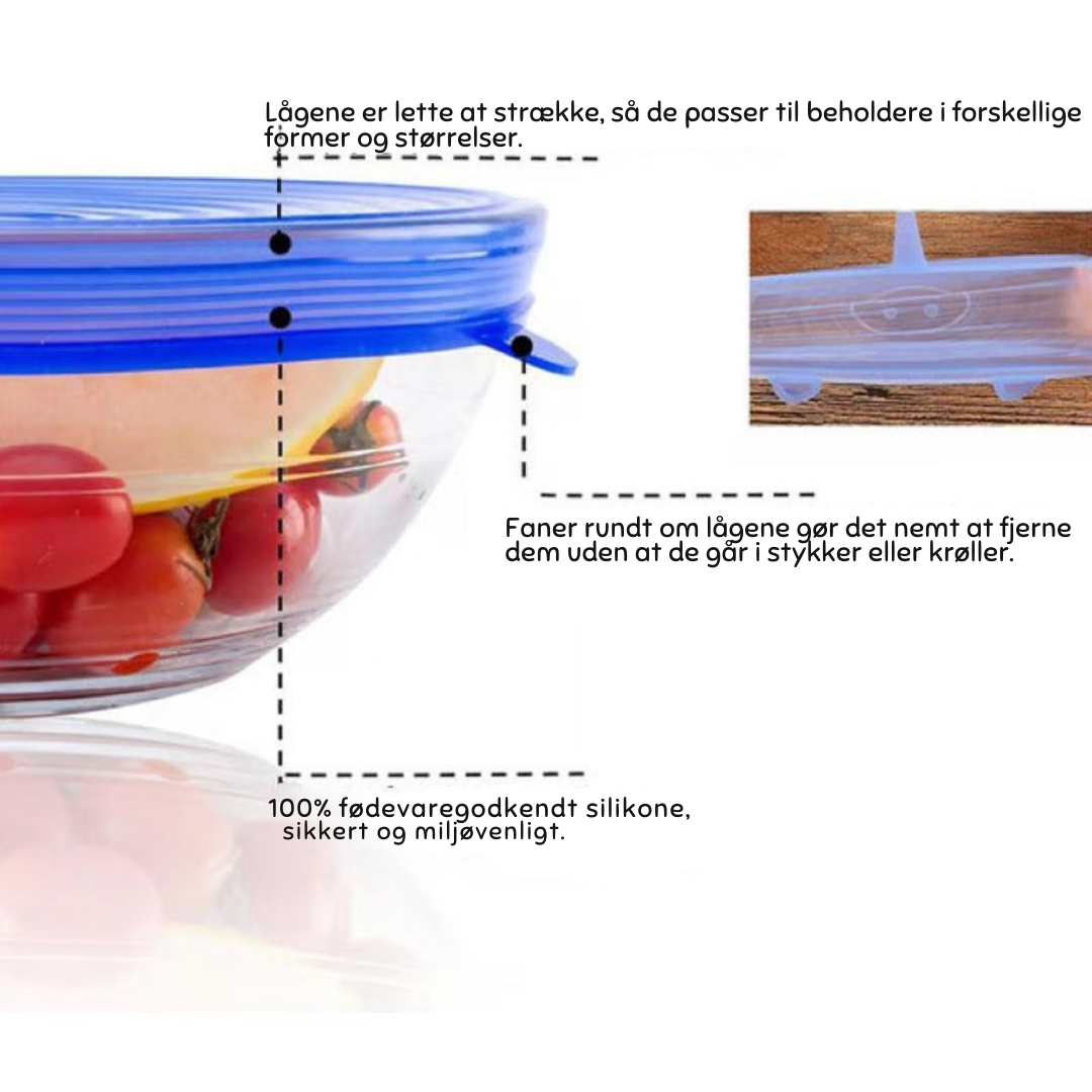 Hold din mad frisk med vores genanvendelige silikonlåg i stretch!