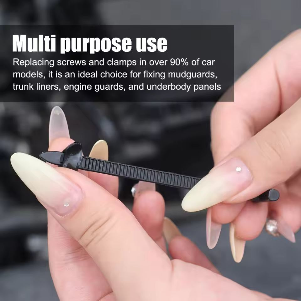 Med sin diskrete form og fleksible størrelse passer denne spænde til alle typer paneler, huller og fastgørelsesbehov. Den er perfekt til trange rum, hvor traditionelle fastgørelsesmidler ikke kan nå, eller hvor brug af værktøj er begrænset. Den er designet til engangsbrug og giver en stærk, holdbar fastgørelse, der ikke løsner sig over tid.