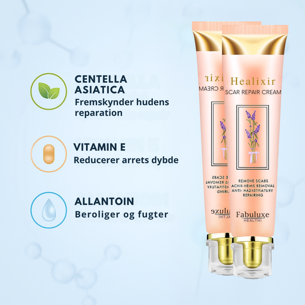 Healixir™ er en højkoncentreret creme udviklet til at reducere ar synligt på få dage. Med 100% naturlige ingredienser trænger den dybt ind i huden, stimulerer helingen og hjælper huden med at genopbygge sig selv – for en glattere, mere ensartet hud.