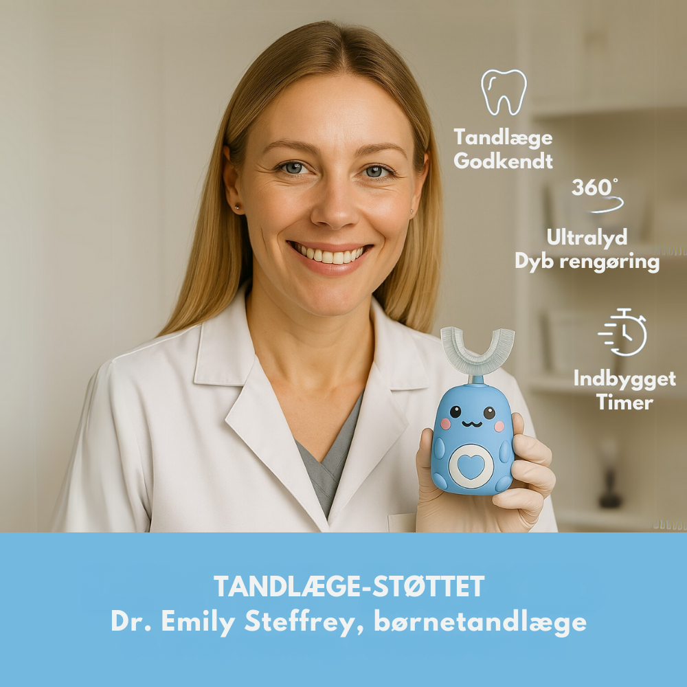 KiddieBrush™ er en innovativ U-formet 360° tandbørste, der gør det let for børn at børste tænder. Med blid ultralydsteknologi rengør den alle tænder på få sekunder – og forvandler tandbørstning til en sjov og engagerende oplevelse, som børn rent faktisk glæder sig til.