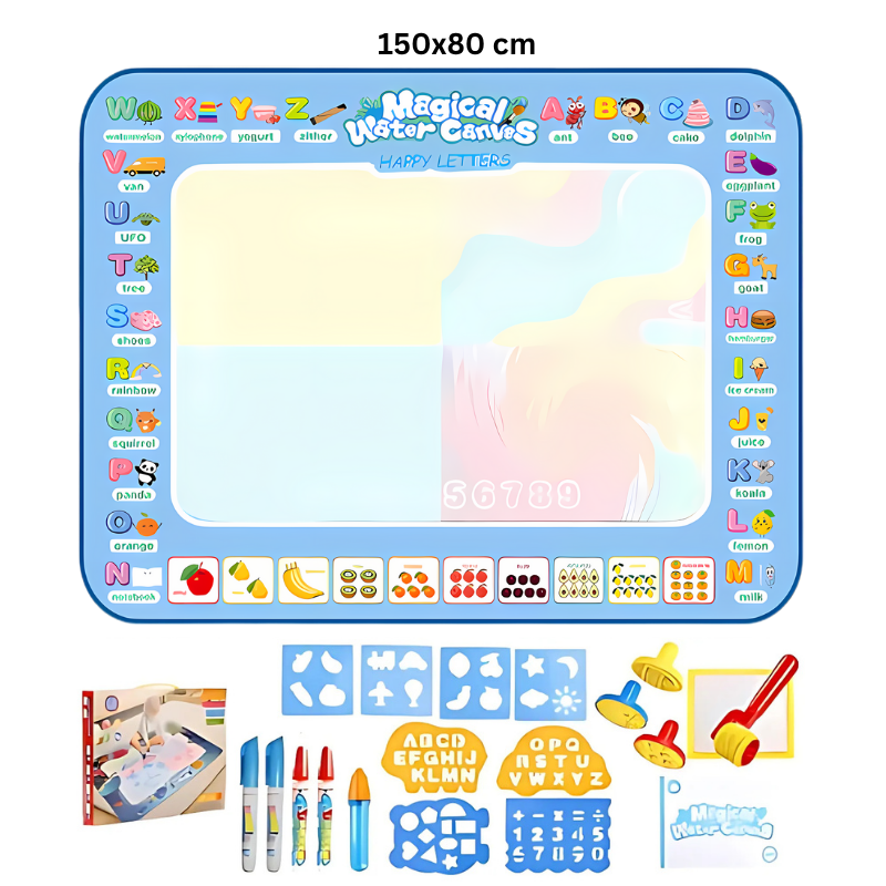 Se dit barns fantasi komme til live, når simpelt vand forvandles til lyse, farverige tegninger. Denne rengøringsvenlige måtte lader børnene skabe igen og igen – bare tilføj vand og se det forsvinde, når det tørrer. Perfekt til endeløs leg, læring og kreativitet uden oprydning!
