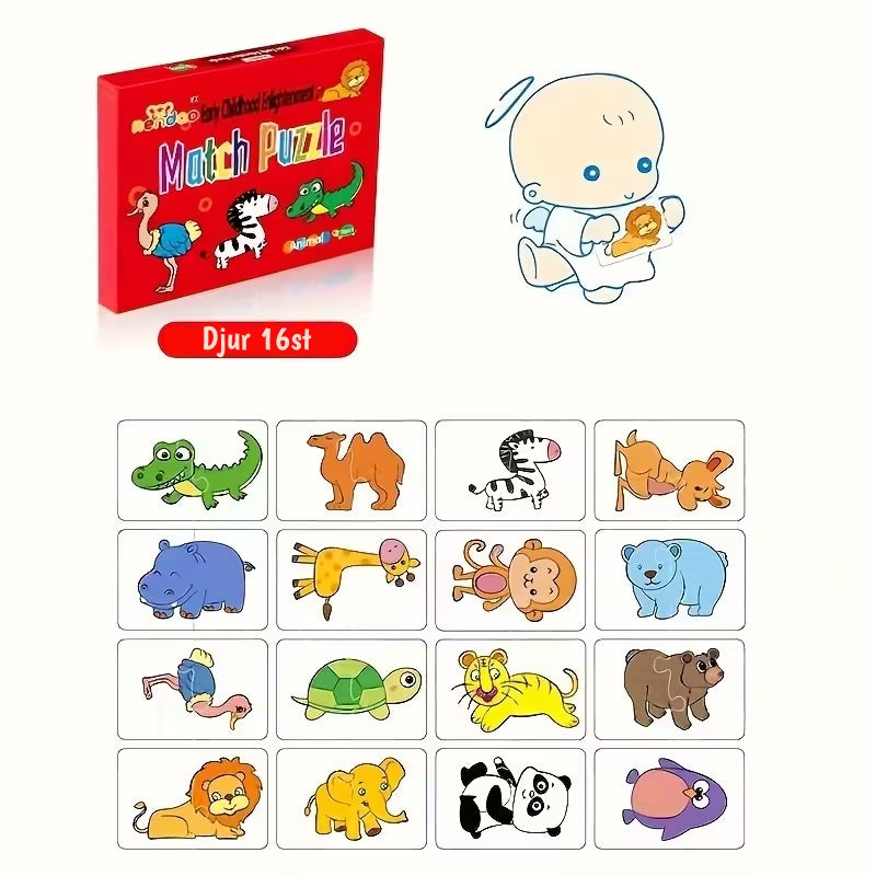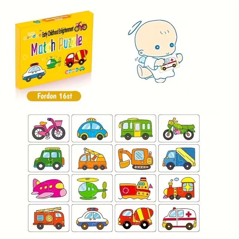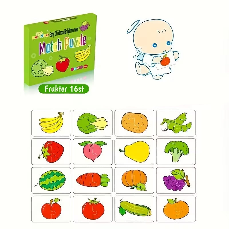 Et pædagogisk og farverigt sæt med 32 puslespilsbrikker, der danner 16 matchende par. Vælg mellem forskellige temaer som køretøjer, frugter eller dyr. Puslespillene hjælper børn med at udvikle hukommelse, logik og genkendelse på en sjov måde.