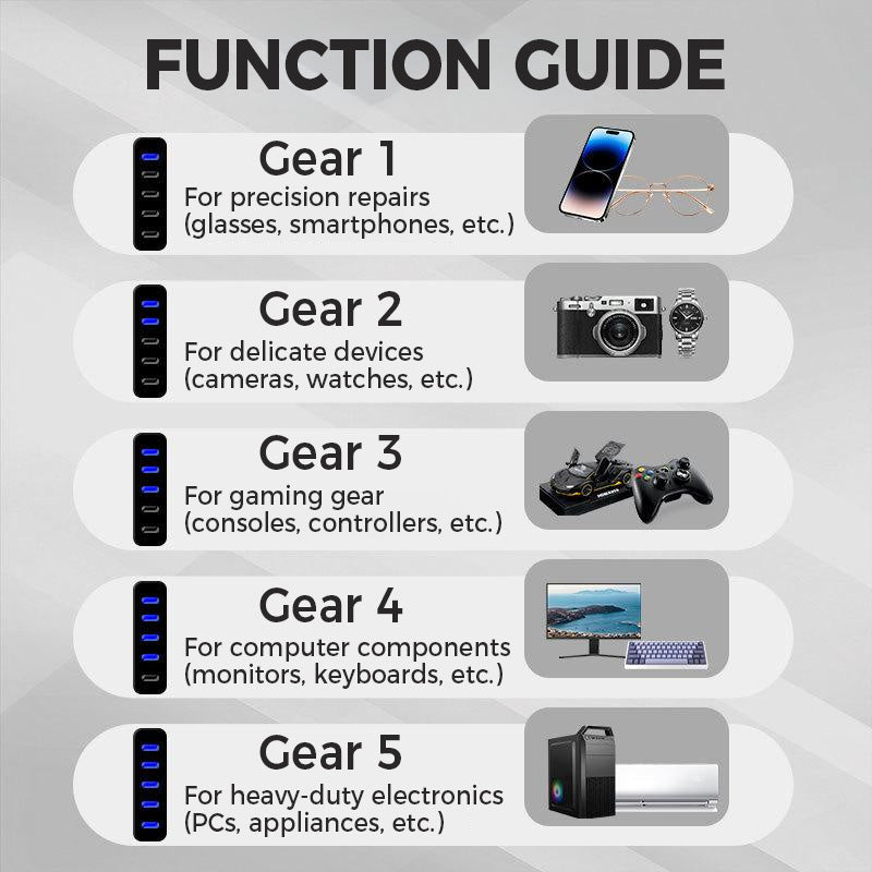 Hastighed 1: Telefoner | Hastighed 2: Ure, Kameraer | Hastighed 3: Modeller, Spilkonsoller | Hastighed 4: Skærme, Tastaturer | Hastighed 5: Computere, Husholdningsapparater. Det justerbare drejningsmoment sikrer perfekt håndtering til alle projekter.