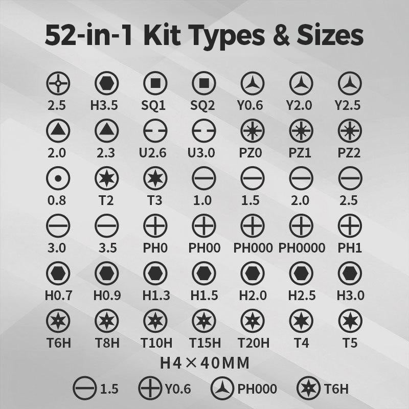 Dette alt-i-ét-sæt indeholder præcisionsbits, der dækker alt fra sart elektronik til tunge apparater. Uanset om du reparerer smartphones, ure, kameraer eller endda husholdningsapparater, eliminerer dette sæt behovet for flere værktøjer. Det organiserede udvalg sikrer, at du altid har de rette bits til jobbet, hvilket sparer tid og frustration.