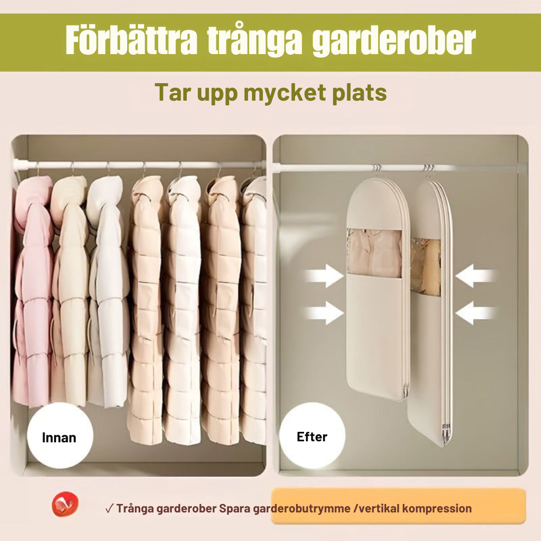 Effektiv og nem at bruge: ingen støvsuger nødvendig! Læg blot dit tøj i, luk lynlåsen og komprimer. Et hul i toppen gør det muligt for alle typer bøjler at blive hængt igennem.