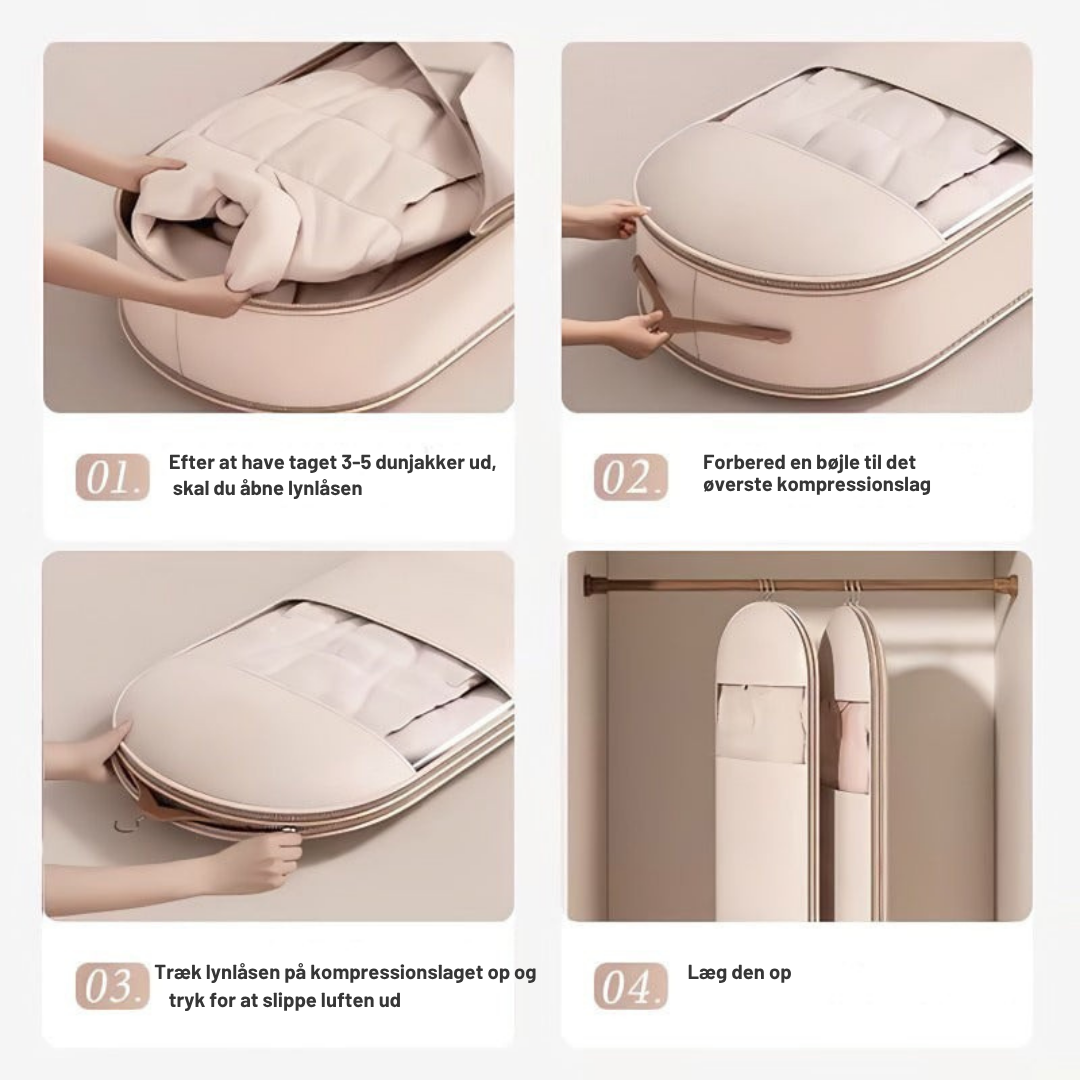 BESKYTT DINE TØJ – I modsætning til andre opbevaringsløsninger komprimerer vores pladsen uden at ændre din dunjakke blødhed. Den forhindrer rynker og deformation, så den altid er ren og pæn, når du tager den ud til næste kolde sæson. Giv dit tøj et rent og selvstændigt rum og hold dem i perfekt stand året rundt.